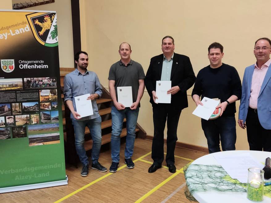 Für die Ausgestaltung des Geländes hinter der Kindertagesstätte wären die Förderbeiträge der Dorfmoderation freigegeben, die Gemeinde suche weiterhin einen Gemeindearbeiter und für den Ruheforst im Vorholz läge eine hohe Nachfrage vor, für die eine Erweiterung erfolgen würde, war zu hören. Der Ortsbürgermeister betonte, dass die energetische Sanierung der gemeindeeigenen Gebäude unabdingbar sei. Nur wo das Geld dafür hernehmen, das sei noch eine offene Frage. Der Hinweis auf die 35-jährige Jumelage mit Stutzheim-Offenheim 2024 leitete zur Ehrung von fünf Feuerwehrkameraden über. Gemäß Gemeinde-Ehrenordnung wurden Christoph Bienroth, Matthäus u. Johannes Knobloch, Walter Odermann und Uli Trautwein ausgezeichnet. Auch hervorragende sportliche Leistungen wurden gewürdigt. So gab es für die junge Offenheimerin Nele Götzl, Trampolinspringen, und für die SV Badminton-Mannschaft U11 jeweils einen Gutschein.