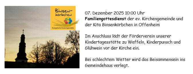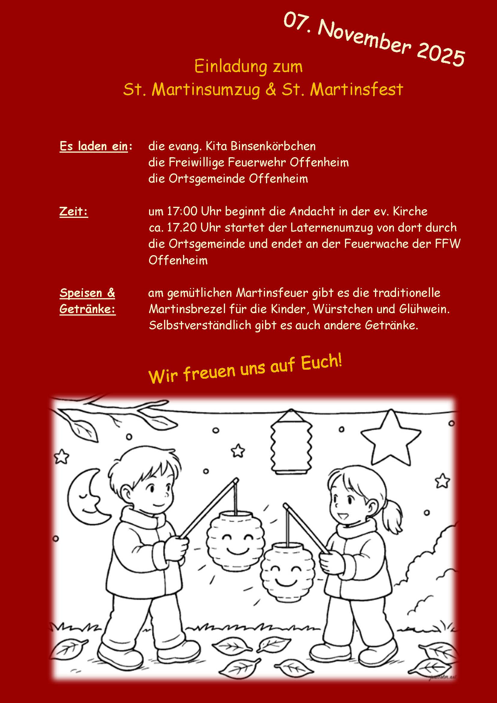 17:00 Uhr Andacht in der ev. Kirche; 17:20 Uhr Start des Laternenumzuges Ende wie immer bei der FFW Offenheim – hier gibt es dann die Martinsbrezel, Würstchen und Getränke um den Umzug gemeinsam ausklingen zu lassen.